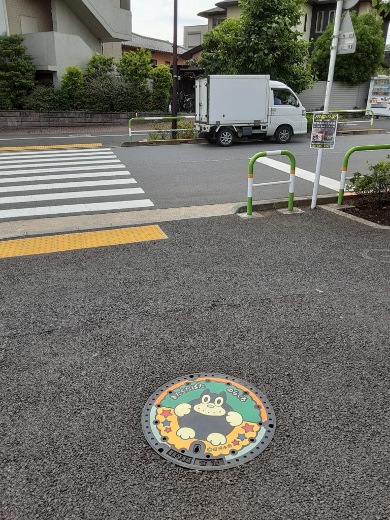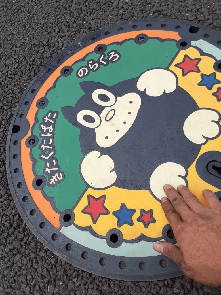 のらくろマンホール かえるさんぽ 2021.06.07 ん? のらくろだ! 漫画『のらくろ』シリーズの主人公のらくろ(本名:野良犬黒吉)をモチーフにしたマンホール蓋です。作者の田河水泡は、1929年から1931年まで田端に居住し、『のらくろ』を発表。厳しい境遇にも負けず、自分の生きる道を切り開いていく姿は人気を博し、昭和初期を代表する漫画となりました。設置場所北区田端5丁目4番1号(田端小学校のプール側の道路)【北区総合案内からの引用】 のらくろマンホールを触ってみたらツルツルでした。因みに土木作業員の手はこんな感じでボロボロです。