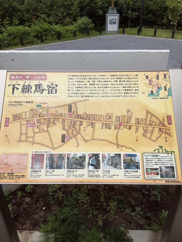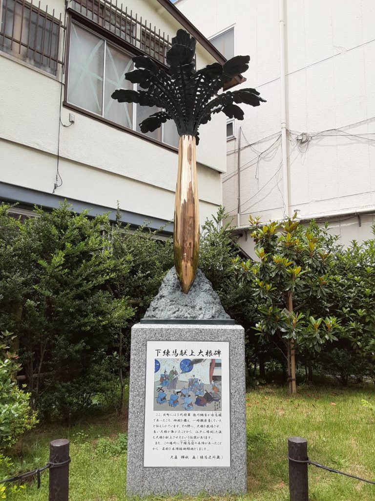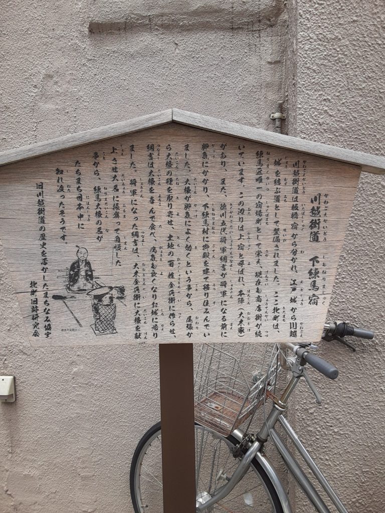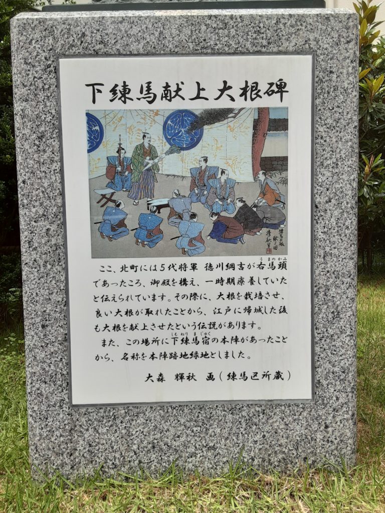 練馬大根発祥の地 下練馬宿(練馬北町商店街) かえるさんぽ 2021.06.10 北町商店街を散歩していたら立て札がありました。 なにやら下練馬宿の事を説明している。 更に北町商店街を散歩していたら公園がありました。 練馬区で唯一の宿場【下練馬宿】当時の案内図付きでの説明 公園の名は【練馬区立☆本陣跡地緑地】 まばゆい光を放つ黄金に輝く練馬大根(だいぶ誇張しています……) 練馬大根の伝説と公園の名の由来