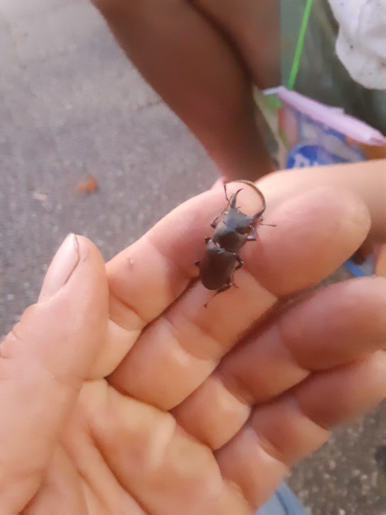息子は虫が嫌いですが勇気を出してコクワガタを手で掴みました。少し成長した夕方でした。