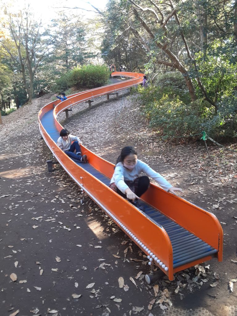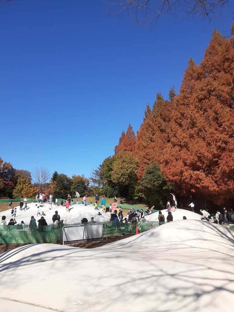 国営昭和記念公園 かえるの足跡 2021.12.02 バスと電車を利用して立川市にある国営昭和記念公園に行きました。立川市は都会でビックリしました。又、昭和記念公園は広すぎるので筋肉痛になると思い園内の移動はトロッコの様な連結式のバスを利用しました。はじめに向かった場所は【子どもの森】です。日本一大きいとされるハンモックがありました。ハンモックで遊んだ感想を子どもたちに聞くと「足が痛かった。」と言われたので多分ハンモックとトランポリンを混同してトランポリンの様に遊んだのではないかと思い次は「雲の海(ふわふわドーム)」に向かいました。埼玉県の国営武蔵丘陵森林公園と同じ様なふわふわしたトランポリンが雲の海の様な形をして、その雲に大勢の子ども達が跳ねたり、走ったり、転がったり、大声で騒いだり楽しんでいました。子ども達も大人と同様で相当ストレスがたまっていると思いますので思う存分ストレスを吐き出して楽しんでくれたと思います。又、昭和記念公園の紅葉はとても美しく色付いていたのですが子ども達は全く興味を持ちませんので余り紅葉を観賞することが出来ませんでしたが美術館に展示している様な美しい自然画をリアルで見れた感じで良かったです。又、同公園内にある【昭和天皇記念館】にも営業時間ギリギリでしたが立ち寄る事とができました。昭和天皇が御存命当時は世界が絡む激動の時代でしたので当時の大日本帝国と昭和天皇の生き方を知る良い機会になりました。昭和記念公園は一年を通して遊べる公園ですので又、遊びに行こうと思います。