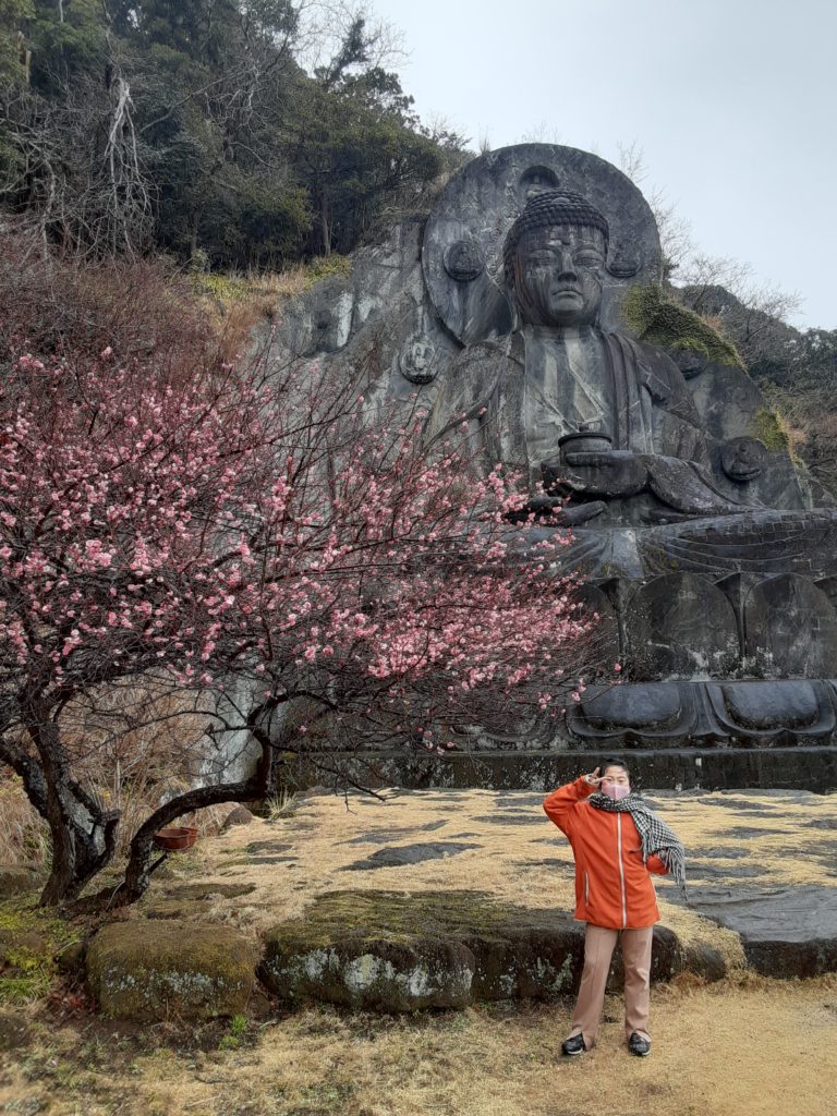 リサイクルショップかえる担当コバヤシです。千葉県の日本寺に座像の石仏としては日本一の大きさを誇る大仏様がいました。正式名は薬師瑠璃光如来(やくしるりこうにょらい)と言います。人々を病から救う如来様だそうで左手に薬の壺を持っています。。さぞかし彫刻を失敗したら偉いことになるなと作者の大野甚五郎さんの心中を考えるとかえるさんは頭が下がる思いになります。又、梅の花がポツリ咲いていました。春は一歩一歩近づいているのだなと思いました。