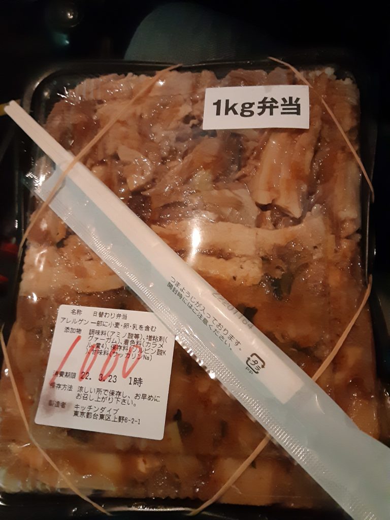 リサイクルショップかえる担当コバヤシです。本日の副業の引っ越し作業が午後10:00頃に終了、帰宅途中かえるさんのお腹が減って来たので秋葉原近くのキッチンダイブでお弁当を買いました。お弁当を温めるのに約8…9分位の時間が掛かり夜中の御徒町は寒かったです。食べた感想は、お腹が減ってたので【1kg弁当】はかえるさんにとって丁度良かったです。又、パンダが可愛いです。