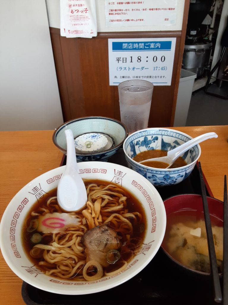 かえるさんはお代わりをしたライスの上に赤味噌のもつ煮汁をぶっかけて心を乱すことなくムシャムシャお口に頬張っていました。そしてラーメンも注文していたのでムシャムシャ頂きました。このラーメンの料金はなんと【320円‼️】激安です。そして味は正油味のラーメンで麺は平打ち太麺だったかな?まず、ラーメンの値段が激安ですので感動しました。
